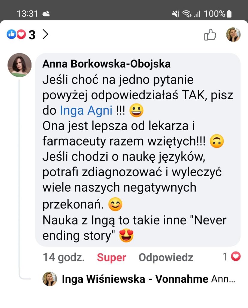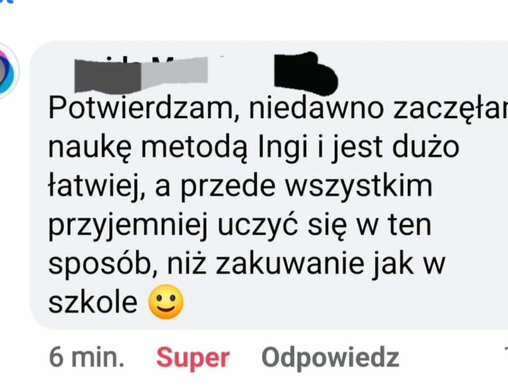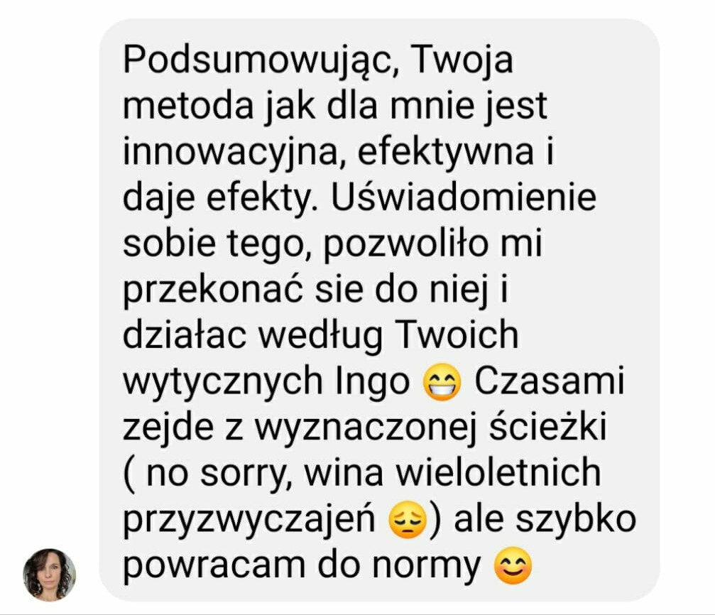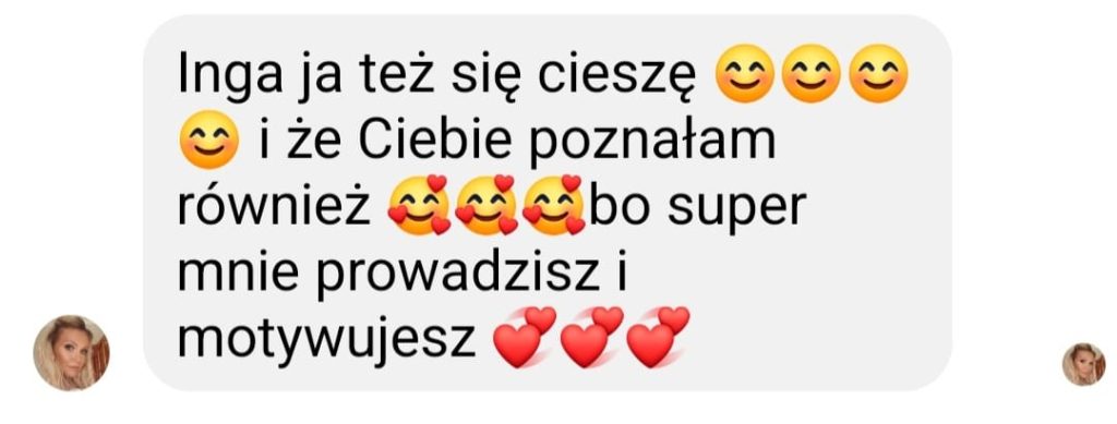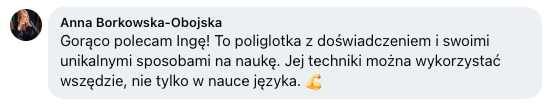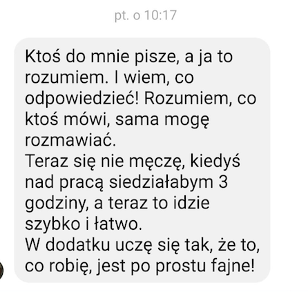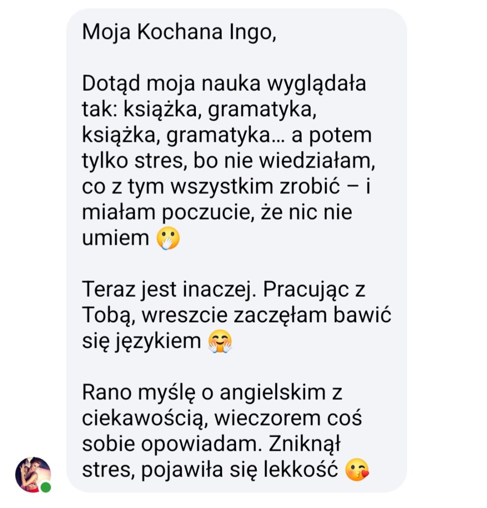 Zgłosiłam się do Ingi, bo bardzo chciałam pokonać swoje lęki i nauczyć się wreszcie języka angielskiego. We współpracy z Ingą bardzo podobało mi się to, że nie było szkolnego nauczania, za to duża różnorodność ciekawych form nauki. Inga dała mi duże wsparcie i nauczyła mnie samodzielności w nauce, co przełożyło się na moje większe zaangażowanie. W rezultacie otworzyłam się na język, mam większą swobodę w rozumieniu i wypowiadaniu się.
