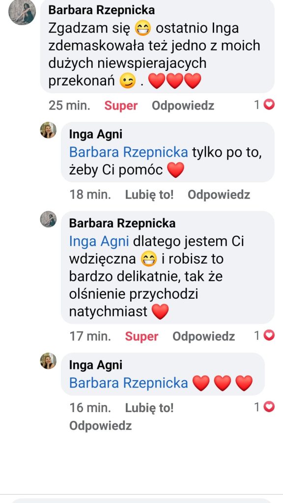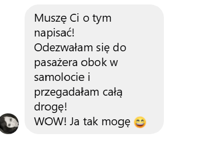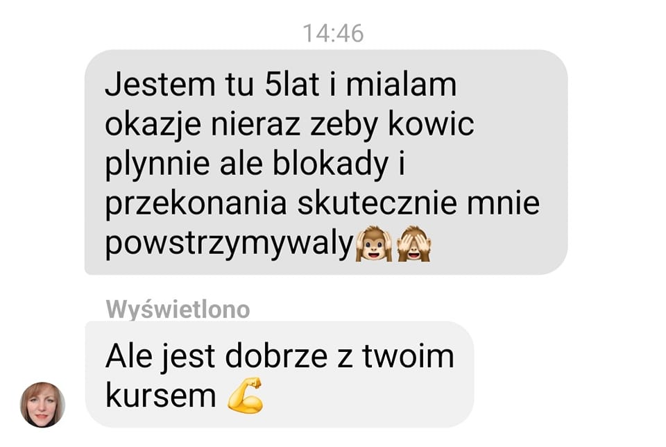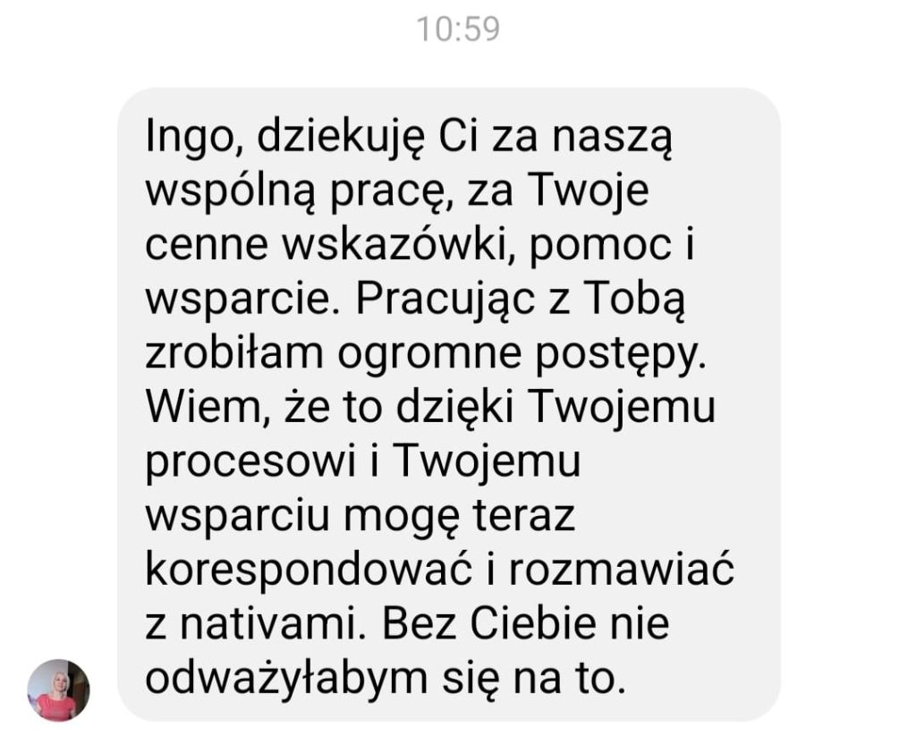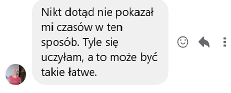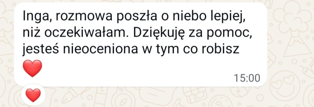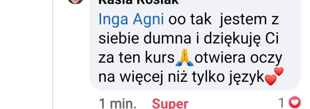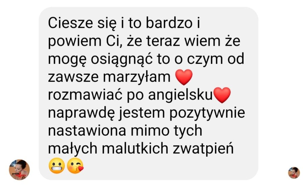 Zgłosiłam się do Ingi, bo bardzo chciałam pokonać swoje lęki i nauczyć się wreszcie języka angielskiego. We współpracy z Ingą bardzo podobało mi się to, że nie było szkolnego nauczania, za to duża różnorodność ciekawych form nauki. Inga dała mi duże wsparcie i nauczyła mnie samodzielności w nauce, co przełożyło się na moje większe zaangażowanie. W rezultacie otworzyłam się na język, mam większą swobodę w rozumieniu i wypowiadaniu się.